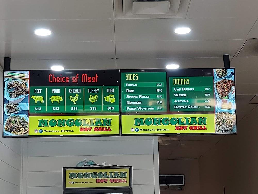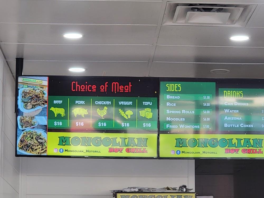 Mongolian Hot Grill offers a diverse menu centered around grilled meats and fresh toppings. Diners can choose from beef, pork, chicken, or veggie options, allowing for a customizable meal experience. The side options, including spring rolls and fried wontons, perfectly complement any main choice. Most meals hover around an average price of $12.57, making it an excellent choice for satisfying hunger without high costs. They also serve drinks, from bottled Cokes to New York-style teas, completing the meal offerings. The menu embodies the essence of simple, traditional cuisine, ideal for an enjoyable dining experience.